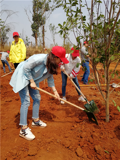 在專業(yè)綠化師傅示范植樹的方法和步驟后。大家在公司工會主席胡云紅的組織下,迅速分為三人一隊,領取鐵鍬、鋤頭、水桶等工具,各自尋找目標,在高差十來米的坡上、坡下兩個種植點,大家分工協(xié)作,填土、撐桿、澆水,用了一個多小時種完了136棵冬櫻花、100棵玉蘭花。并給每棵樹都掛上了簽著自己名字的責任牌。