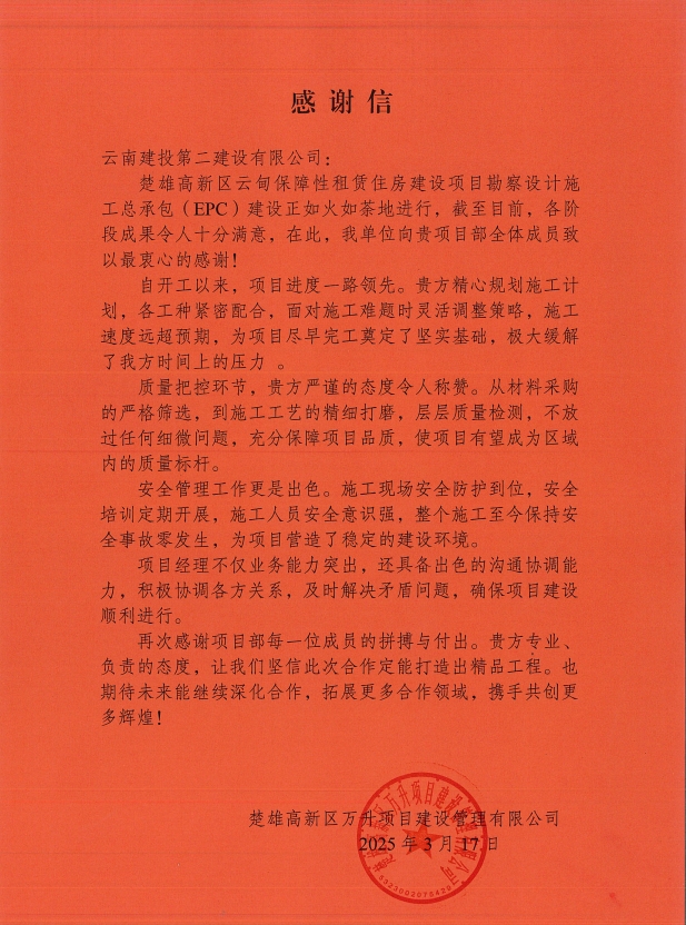 信中對公司在楚雄高新區(qū)云甸保障性租賃住房建設(shè)項目中的卓越表現(xiàn)給予了高度評價與誠摯感謝。信中指出,自項目開工以來,項目進度一路領(lǐng)先,施工速度遠超預(yù)期,項目質(zhì)量把控嚴格,安全管理出色,項目經(jīng)理業(yè)務(wù)能力突出,各階段的成果令人十分滿意。并表示期待未來能繼續(xù)深化合作,拓展更多合作領(lǐng)域,攜手共創(chuàng)更多輝煌。