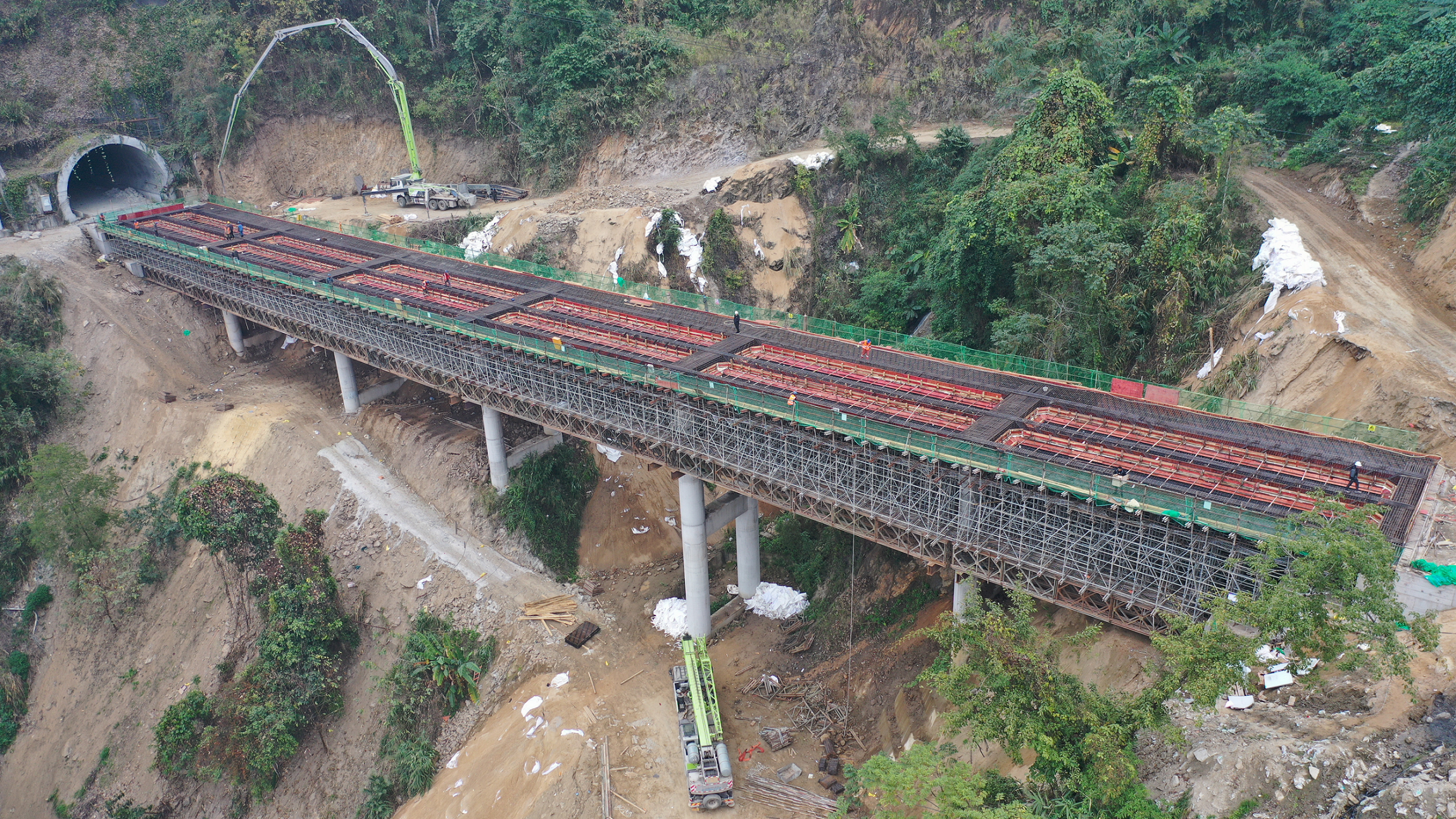 紅莫3號(hào)大橋位于項(xiàng)目標(biāo)段起點(diǎn),左幅現(xiàn)澆箱梁采用組合支架法施工,箱梁混凝土分兩次澆筑,首次澆筑箱梁底板和腹板,第二次澆筑箱梁頂板及翼板,此次為首次混凝土澆筑。為保證混凝土順利澆筑,元綠高速土建五分部提前謀劃落實(shí)各項(xiàng)工作任務(wù),從箱梁架體基礎(chǔ)施工、貝雷片組裝、組合支架搭設(shè)及預(yù)壓、箱梁鋼筋綁扎、模板安裝到混凝土澆筑等各環(huán)節(jié),技術(shù)人員均全程旁站管控,歷經(jīng)17個(gè)小時(shí),最終順利完成混凝土澆筑。接下來(lái),項(xiàng)目部全體成員將在確保安全和質(zhì)量的前提下,加快剩余工程施工。