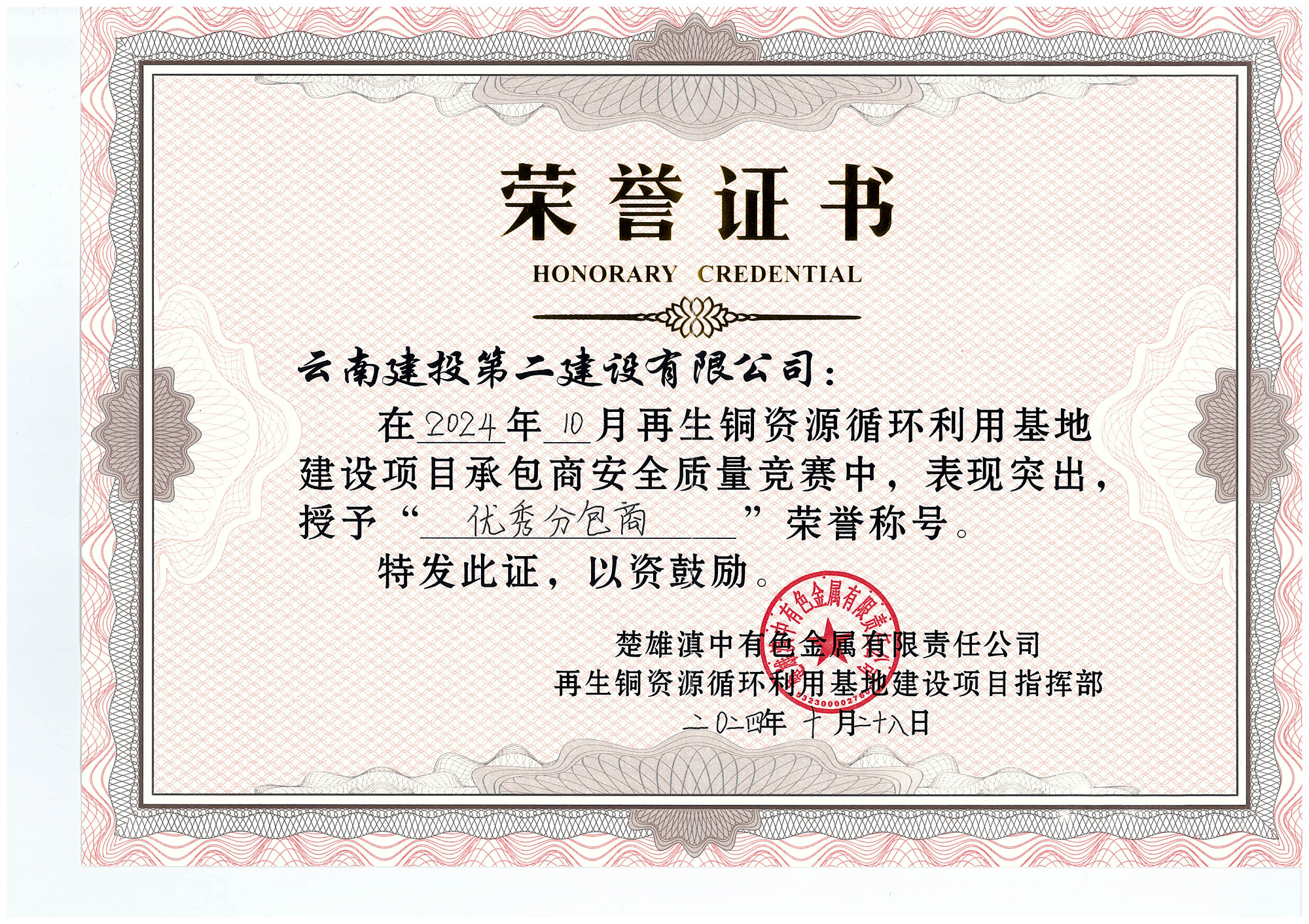 楚雄滇中有色金屬有限責(zé)任公司再生銅資源循環(huán)利用基地建設(shè)項(xiàng)目自2024年6月17日開工以來(lái),嚴(yán)格執(zhí)行公司各項(xiàng)管理制度要求,與業(yè)主單位建立了良好的溝通機(jī)制,在嚴(yán)守安全底線和紅線的同時(shí)高標(biāo)準(zhǔn)控制工程實(shí)體質(zhì)量。本次榮譽(yù)的獲得對(duì)于項(xiàng)目部來(lái)說(shuō)既是鼓勵(lì)也是鞭策,項(xiàng)目部將再加再勵(lì),優(yōu)質(zhì)高效推進(jìn)項(xiàng)目建設(shè),嚴(yán)格按照節(jié)點(diǎn)要求實(shí)現(xiàn)項(xiàng)目投產(chǎn)目標(biāo)。