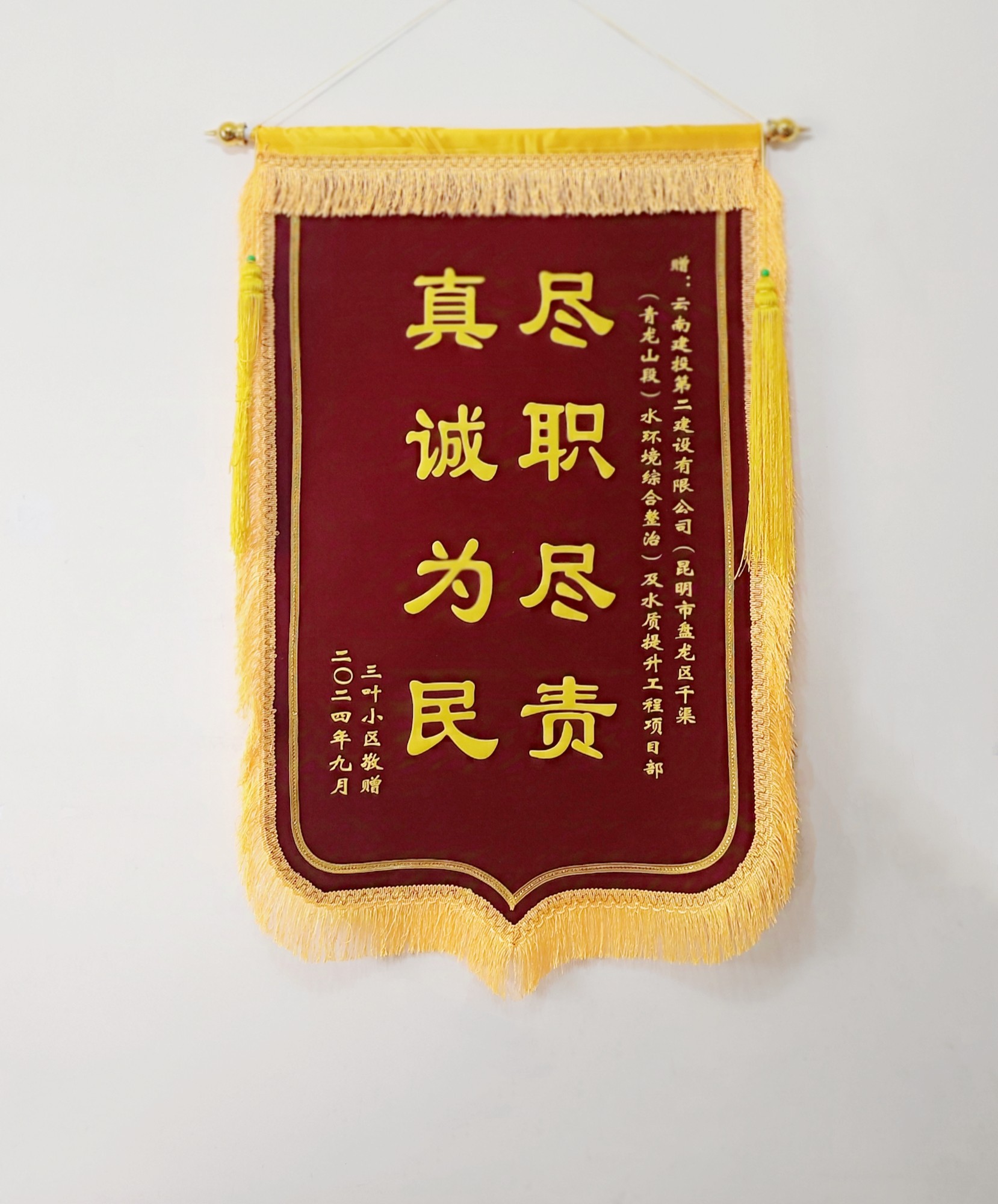 9月9日,第五直管部承建的昆明市盤龍東干渠施工項目收到了來自三葉小區(qū)的一面錦旗,錦旗上印有“盡職盡責(zé)、真誠為民”幾個大字,點贊項目團隊高效推進項目建設(shè),為周邊小區(qū)居民生活提供了便利。