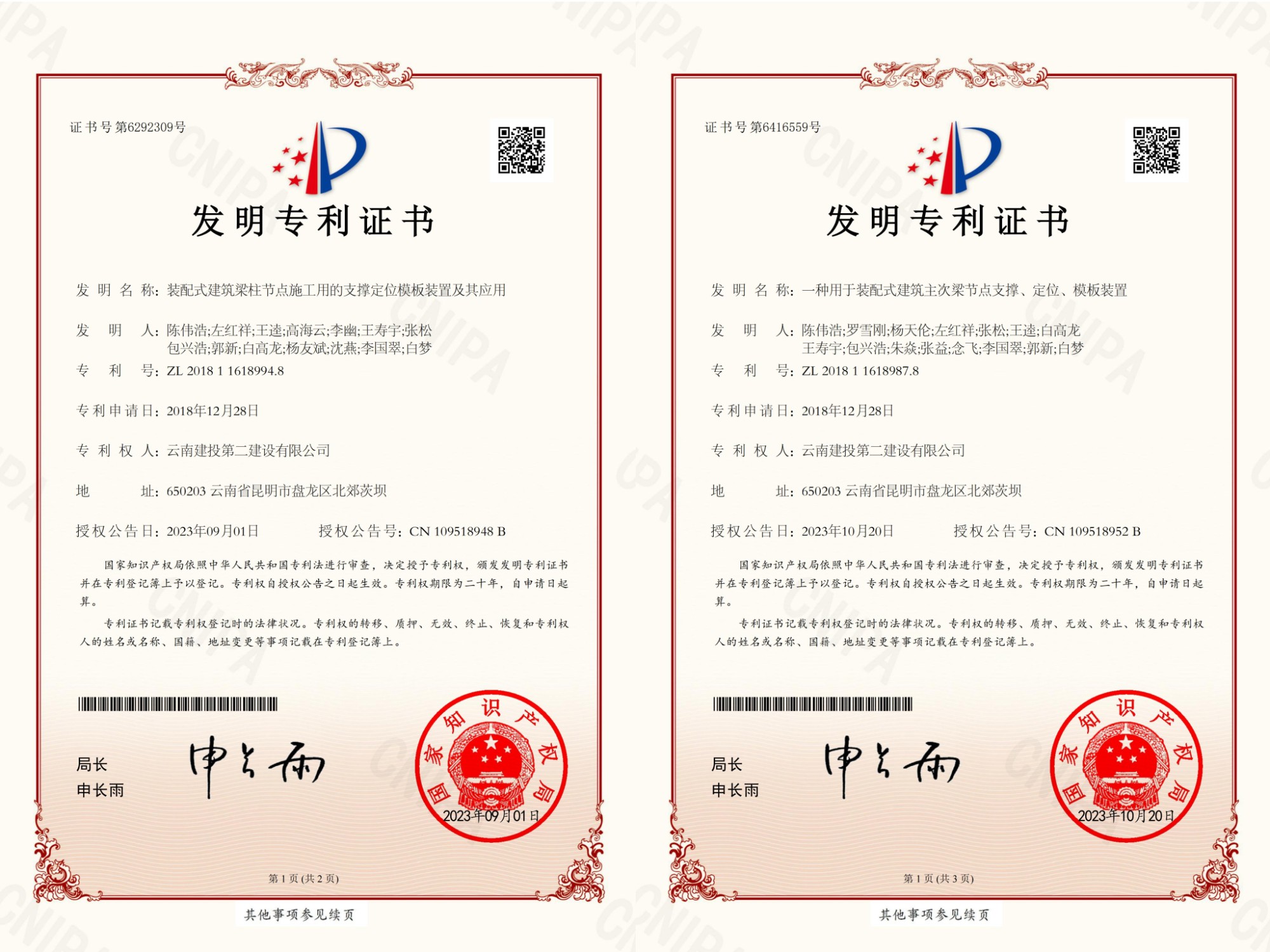 2023年,公司申報(bào)的《一種疊合板鋼筋擺放架》、《一種用于裝配式建筑主次梁節(jié)點(diǎn)支撐、定位、模板裝置》、《裝配式建筑梁柱節(jié)點(diǎn)施工用的支撐定位模板裝置及其應(yīng)用》、《一種電梯施工平臺(tái)及其控制方法》、《一種便攜式建筑施工用激光投線儀》、《一種用于裝配式建筑的多功能支撐頂托裝置》等6項(xiàng)發(fā)明專利獲得國家知識(shí)產(chǎn)權(quán)局授權(quán)。