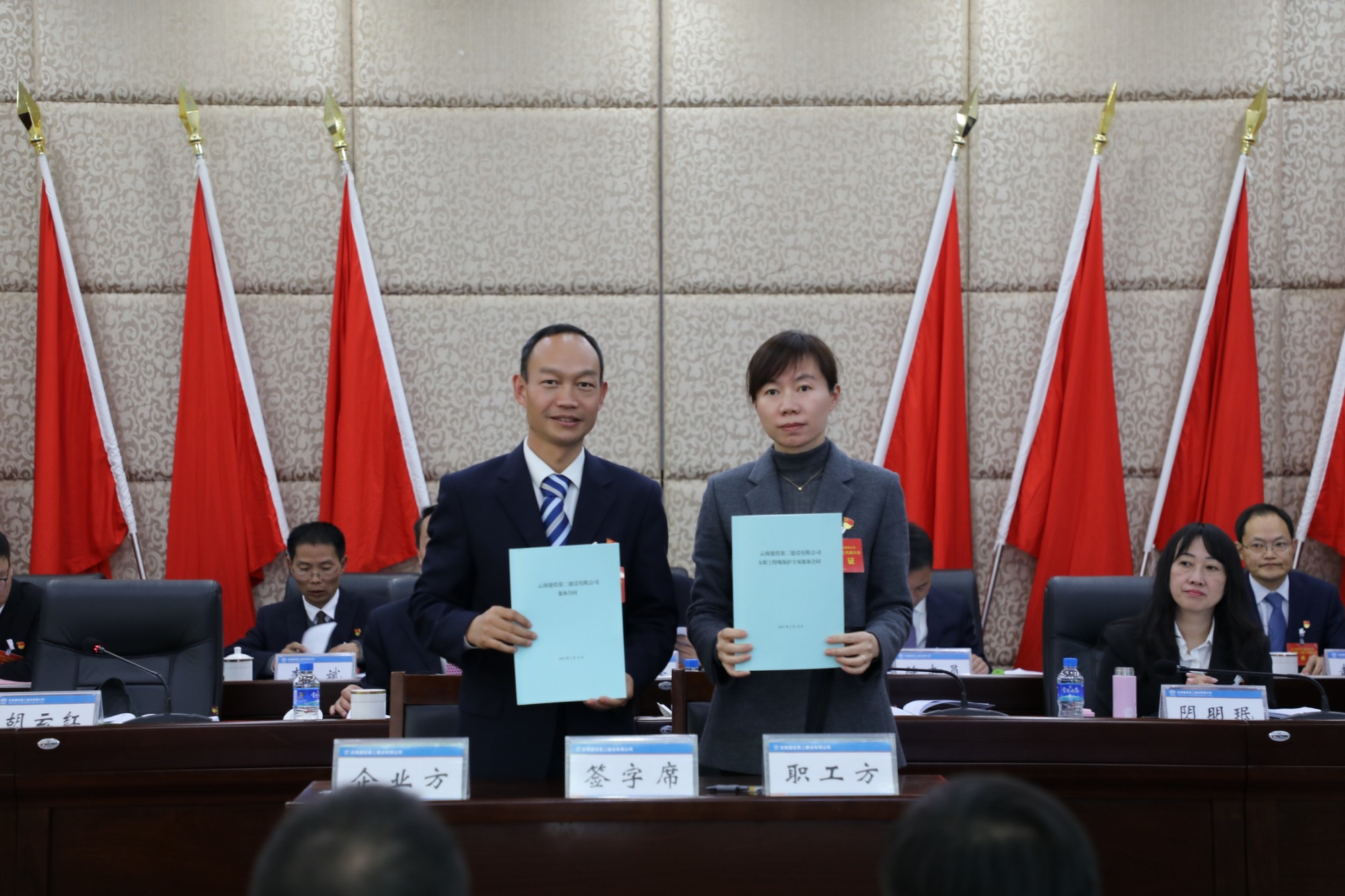 會(huì)上,董學(xué)友、胡云紅分別代表企業(yè)方和職工方簽訂《2023年集體合同》。