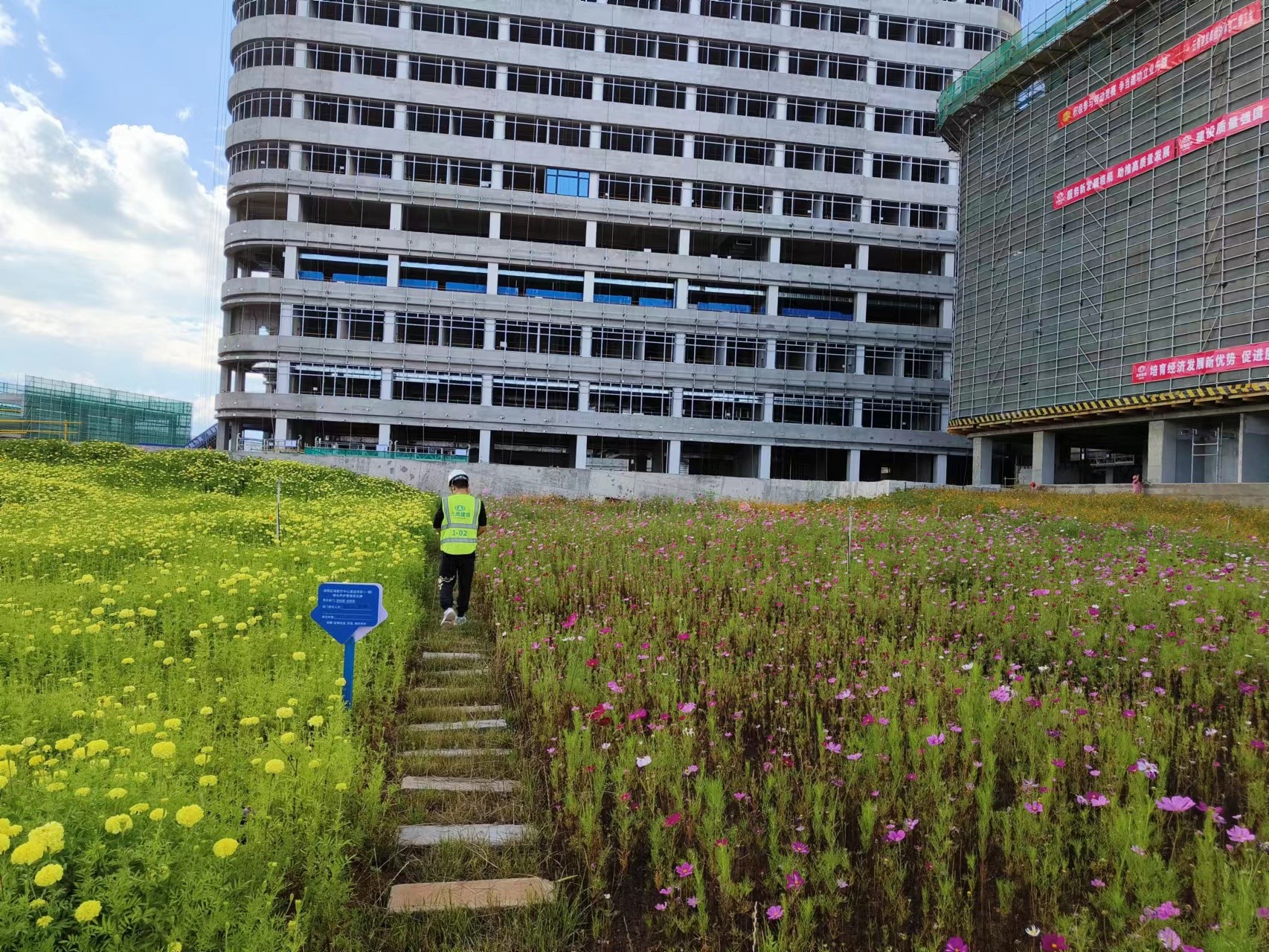 “路雖遠(yuǎn)行則將至,事雖難做則必成”。項目積極探索工地綠化治理模式,在項目經(jīng)理帶領(lǐng)下,經(jīng)過多方考察、認(rèn)真研究,在項目現(xiàn)場室外地塊回填土上劃分地塊分別種植了金雞菊、波斯菊等成活率高、生長快、成本低的宿生草本植物。經(jīng)過實踐證明,這些草本植物一旦長成,不但能夠有效固化地表,防止揚(yáng)塵,還能避免傳統(tǒng)綠網(wǎng)覆蓋容易老化破損、造成環(huán)境污染的問題,對生態(tài)環(huán)境更加友好,視覺效果更加美觀,使用成本至少能夠降低20%。截至目前,地塊栽種的植被全部成活,實現(xiàn)裸露地塊100%覆蓋。