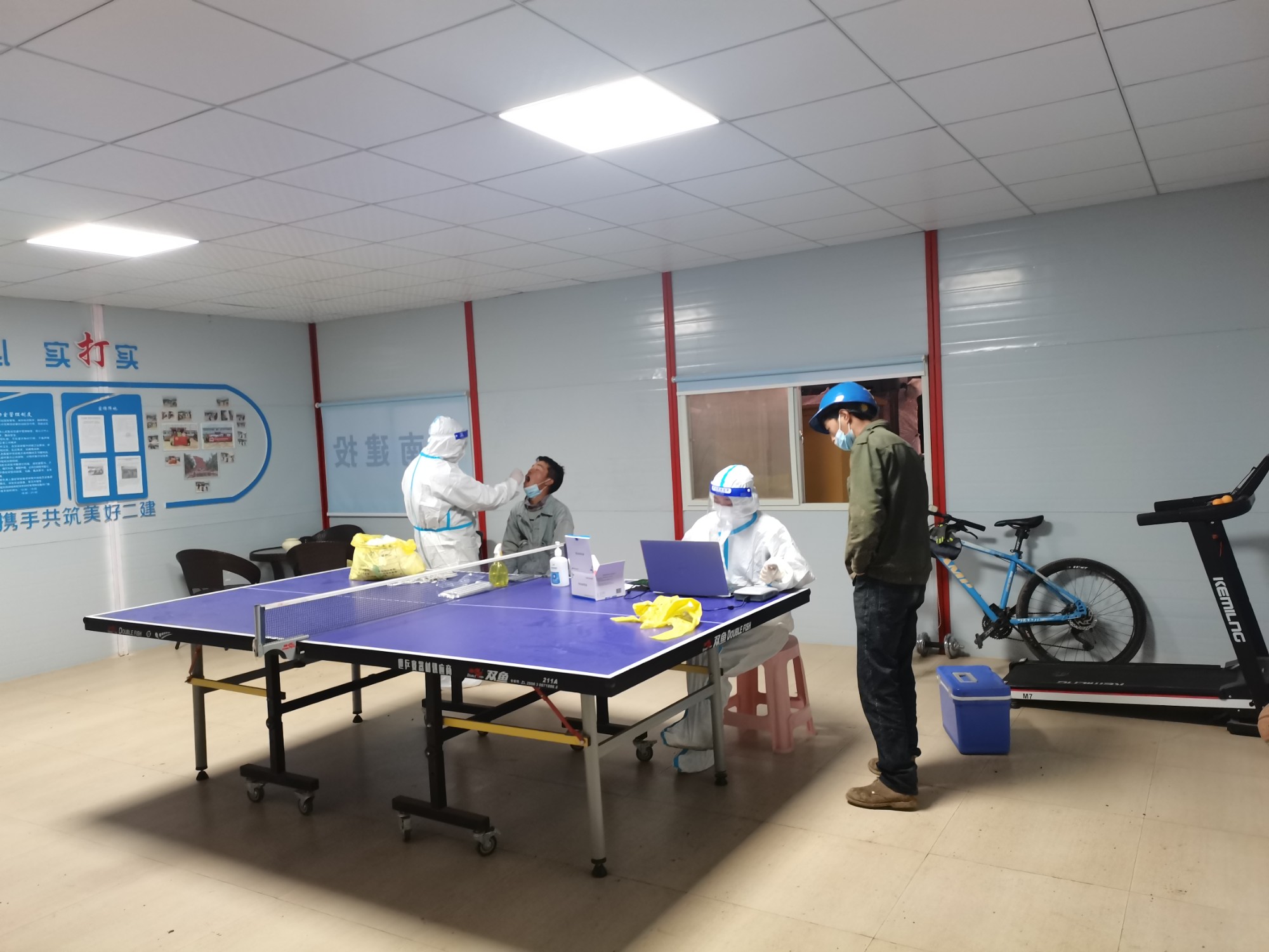 12月24日清晨,直管部接到建設(shè)單位電話,昆明醫(yī)科大學(xué)第一附屬醫(yī)院呈貢院區(qū)發(fā)現(xiàn)新增確診病例4例,昆明再次拉響疫情防控警報。因項目部與檢測點只有一路之隔,建設(shè)方要求項目做好管理措施。為了人民群眾的生命安全和健康,直管部黨支部與項目部當機立斷,黨支部負責人要求立刻組織項目部全員核酸檢測,由于事發(fā)檢測點不能前往,便聯(lián)系了醫(yī)院到現(xiàn)場職工驛站進行檢測,項目管理人員分工協(xié)作,現(xiàn)場掃碼測體溫、查驗健康碼及行程卡、登記身份證……核酸檢測有序進行。檢測完畢后項目部對檢測區(qū)域進行了全面的消毒處理,對疫情隱患進行排查。當晚,檢測結(jié)果顯示59人次全為陰性。