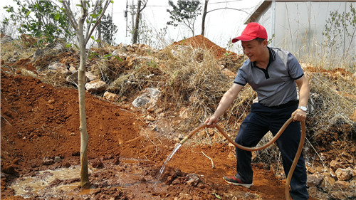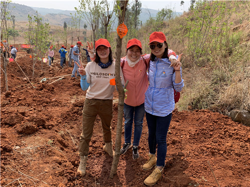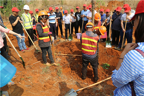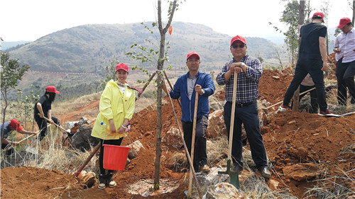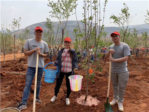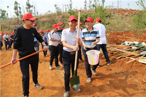 在專(zhuān)業(yè)綠化師傅示范植樹(shù)的方法和步驟后。大家在公司工會(huì)主席胡云紅的組織下,迅速分為三人一隊(duì),領(lǐng)取鐵鍬、鋤頭、水桶等工具,各自尋找目標(biāo),在高差十來(lái)米的坡上、坡下兩個(gè)種植點(diǎn),大家分工協(xié)作,填土、撐桿、澆水,用了一個(gè)多小時(shí)種完了136棵冬櫻花、100棵玉蘭花。并給每棵樹(shù)都掛上了簽著自己名字的責(zé)任牌。