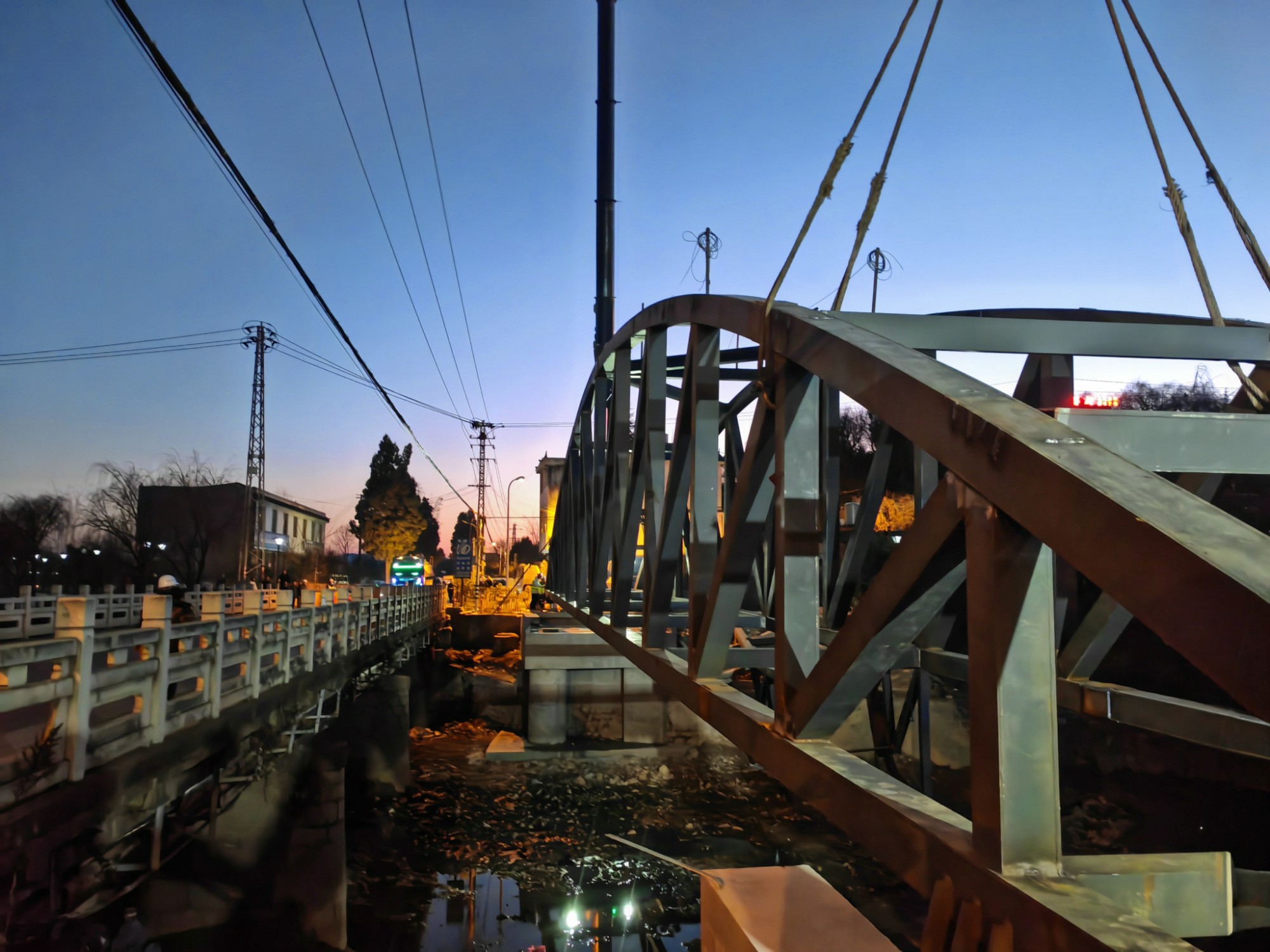 據(jù)悉,此橋梁位于龍西路與龍湫路交叉口,橫跨馬龍河,最大跨距43m,結(jié)構(gòu)形式為鋼桁結(jié)構(gòu)橋,橋梁吊裝重量為47噸。